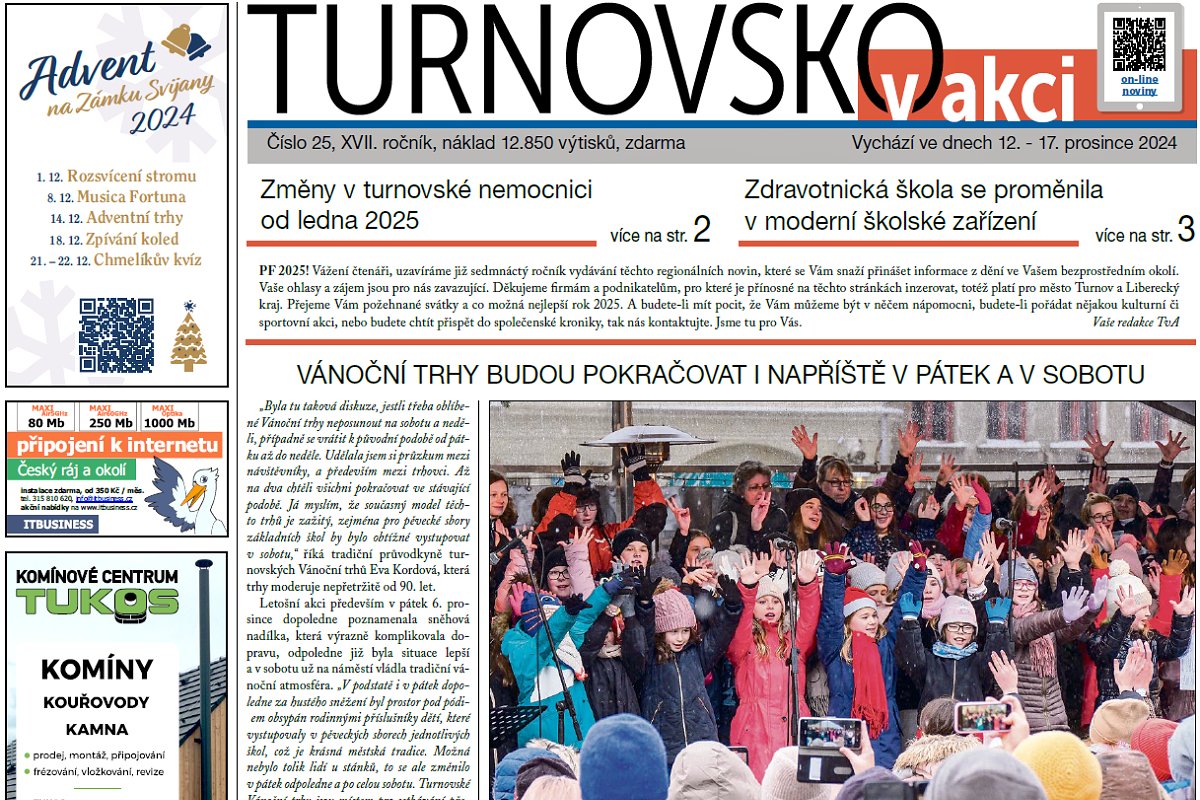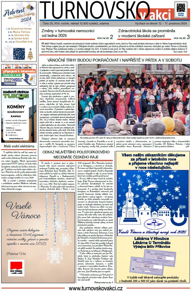 Poslední vydání novin TvA 17. ročníku. Ohlédnutí za dvěmi nejdůležitějšími adventními akcemi v Turnově – první adventní nedělí a Vánočními trhy. Rozhovor se synem mecenáše a filantropa Bohuslava Jana Horáčka. Zásadní změny v poskytování ambulantní péče v turnovské nemocnici od ledna 2025. Úspěšná firma KV Final se sídlem v Doubí u Turnova se dále rozvíjí. Zdravotnická škola se proměnila v moderní školské zařízení. Záměr výstavby bytových domů v ul. 5. května. Prohlášení turnovských Pirátů. Pozvánka na 50. ročník Silvestrovského běhu a na Novoroční ohňostroj. Sportovní servis. Kulturní a sportovní pozvánky a společenská kronika…