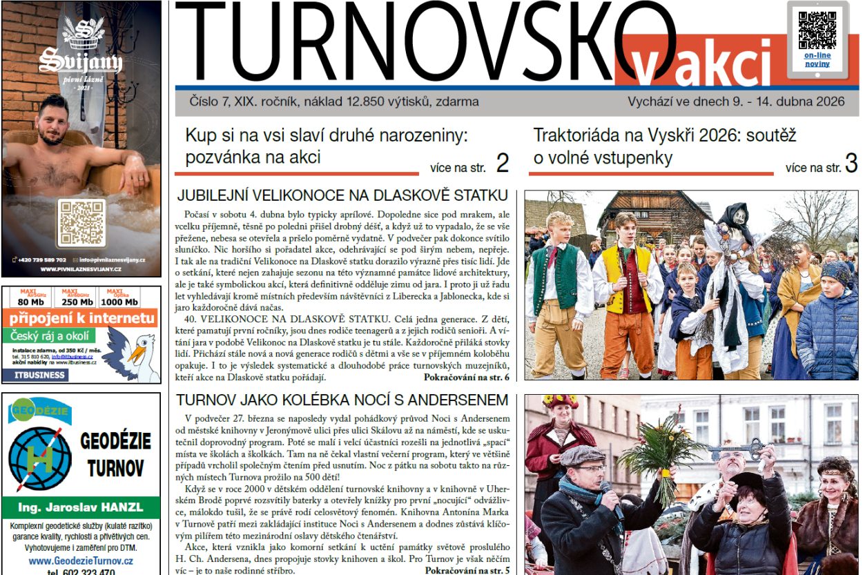 Jubilejní Velikonoce na Dlaskově statku, ohlédnutí za Nocí s Andersenem. Zásadní rekonstrukce turnovského nádraží má zelenou. Dopravní komplikace v Hrubé Skále. Pozvánka na velkou fotbalovou slavnost. Kup si na vsi slaví druhé výročí. Okno lékárníka. Volné vstupenky na Traktoriádu. Víte, jaké byly nejvyhledávanější turistické cíle v Českém ráji v loňském roce? Na turnovské radnici ocenili práci učitelů. Pozvánka na zahájení turistické sezony – Český ráj dětem. První letošní vítání nových občánků Turnova. Kulturní a sportovní pozvánky, společenská kronika…