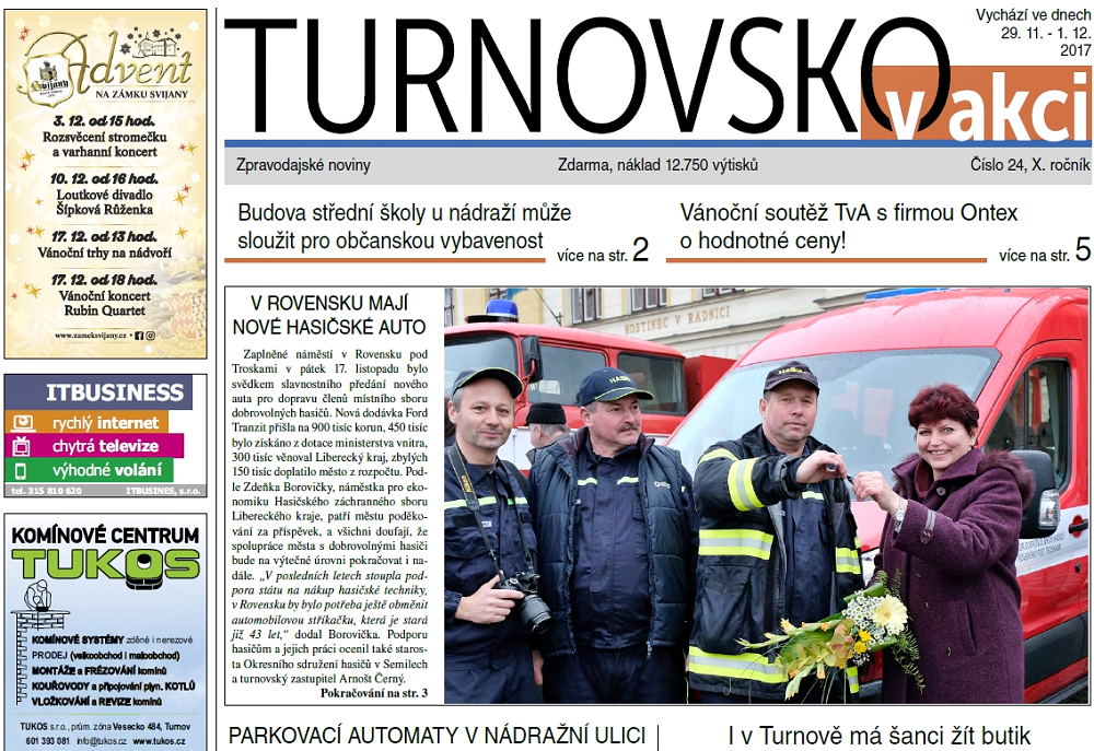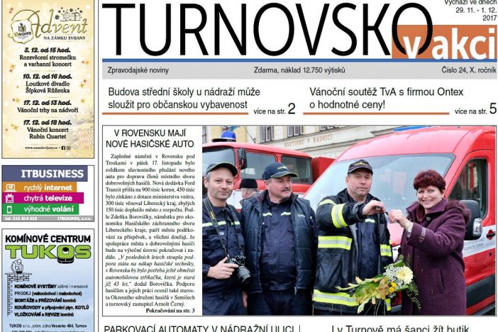 A máme tedy předposlední vydání novin TvA v letošním roce. Jeho obsah se vrací k důležité události pro Rovensko pod Troskami – předání nového automobilu pro místní sbor dobrovolných hasičů, v novinách najdete informace o parkovacích automatech v turnovské Nádražní ulici i o využití části budovy střední školy v Alešově ulici u nádraží pro potřeby města. Reportáž je zde z otevření staronového butiku Styl v Palackého ulici, informujeme o ceně vodného a stočného v příštím roce. Zastupitelé se v anketě zamýšlejí nad potřebami města; společně s firmou Ontex je vyhlášena vánoční soutěž!