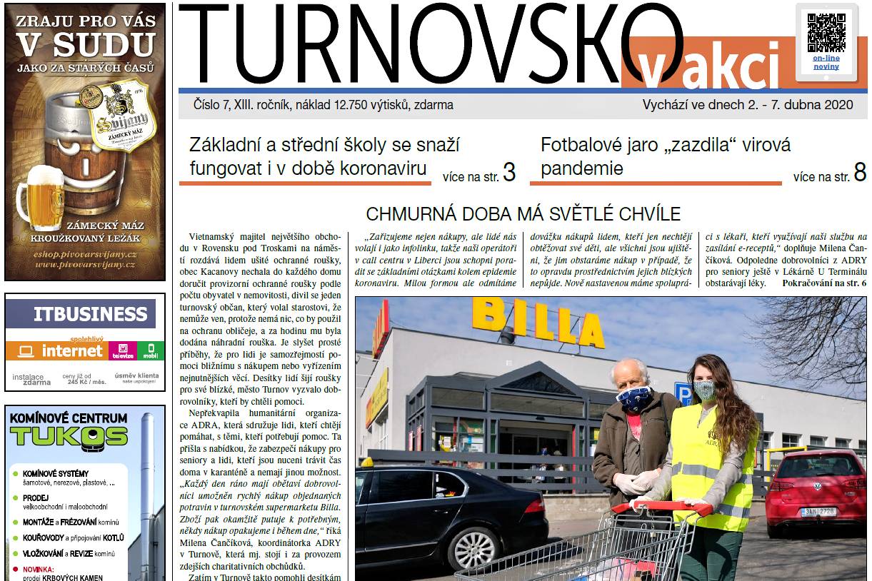 Po dobu trvání nouzového stavu jsou omezeny služby České pošty, bohužel se to týká i roznosu novin. Nevzdali jsme se a ve velmi krátké době jsme dali dohromady nejen distribuci novin do většiny schránek obyvatel Turnova, ale také obyvatel spádových obcí. Zde patří velké poděkování starostům a dalším zástupcům obcí. Díky jejich iniciativě zde roznesou noviny do schránek vlastními silami, jinde využijeme otevřených obchodů, případně dalších služeb, kde jsou výtisky soustředěny a obec na tuto skutečnost vhodným způsobem občany upozorní. V mnoha případech se tak noviny dostávají do rukou občanů dříve, než tomu bylo v případě centrálního roznosu.