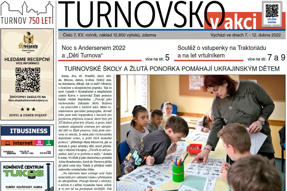 Turnovské školy a Žlutá ponorka pomáhají ukrajinským dětem, vize rozvoje města, revitalizace sídliště Přepeřská. Děti vynesly Moranu, jaro je tady. Den učitelů a ocenění pedagogové. Ohlédnutí za Nocí s Andersenem 2022, soutěže o volné vstupenky na Traktoriádu na Vyskři a na vyhlídkový let vrtulníkem. Součástí novin je kulturní a sportovní servis a společenská kronika.