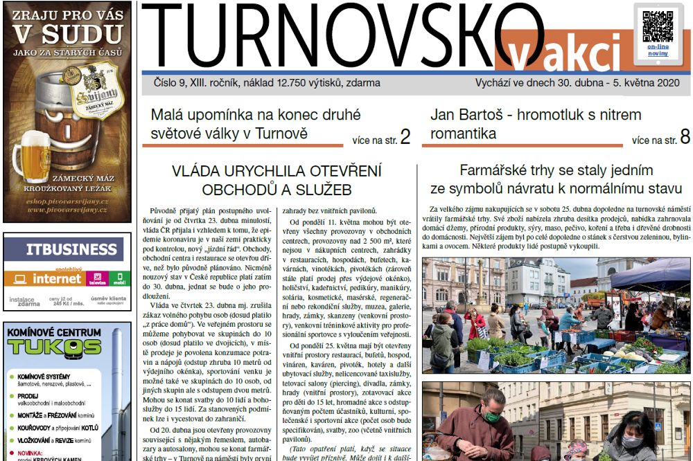 Vláda urychlila otevření obchodů a služeb. A jak je to s otevřením jednotlivých organizací, jako jsou muzeum, kulturní centrum, knihovna a další v Turnově? Farmářské trhy jako symbol návratu k normálnímu stavu, rozhovor se starostou Turnova – tentokrát více na ekonomické téma. Malá vzpomínka na II. světovou válku, Magazín Libereckého kraje, životní příběh Jana Bartoše… To je stručný obsah v pořadí letošního devátého vydání novin TvA.
