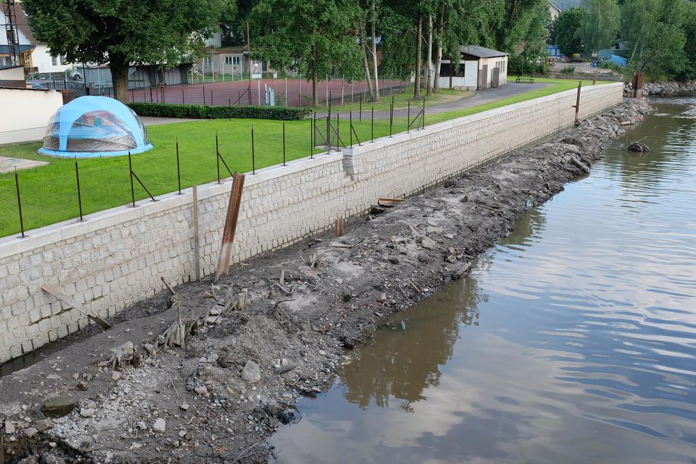 A právě v tomto období sehrál jednu ze svých nejhlavnějších rolí nový jez. „Díky jeho sklopení jsme rapidně snížili hladinu vody, takže jsme pod její úrovní a ochranou štětových stěn (ocelové piloty spojené pomocí speciálních zámků – pozn. aut.) mohli založit základy opěrné zdi z lomového kamene,“ přiblížil výrobní postup hydrotechnické stavby její vedoucí Martin Beňák. Při pohledu z mostu levý břeh Jizery byl kamennou zdí o šířce 30 cm a výšce bezmála čtyř metrů osazen od vyústění náhonu tzv. malé Jizery, aby po svém dokončení zhruba padesát metrů za mostem a zkosením hlouběji do břehu vytvořil jakési rozšířené hrdlo pro regulaci přívalu větší vody.