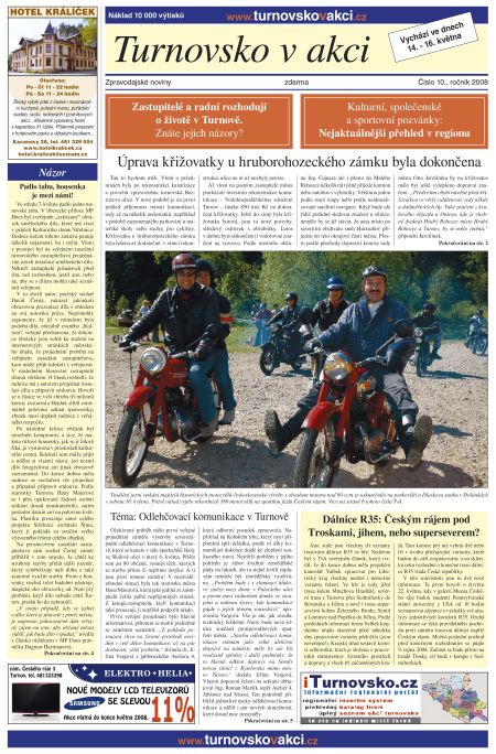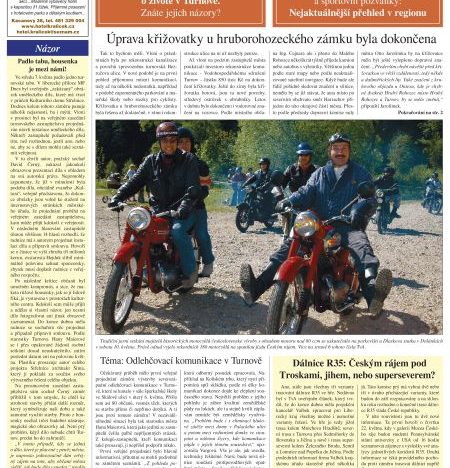 Zatím batolecí věk má za sebou tištěná verze TURNOVSKA V AKCI. První číslo vyšlo před půlrokem, v těchto dnech je v distribuci již desáté letošní číslo. Co přináší? Samozřejmě obsahuje záznam z veřejného představení odlehčovací komunikace, je tu i názor vydavatele na způsob prosazovaní uměleckého díla na Střelnici, najdete zde pohledy dvou zastupitelů na problémy Turnova. V novinách jsou nejaktuálnější pozvánky na kulturní, společenské a sportovní akce v regionu, tou hlavní je nadcházející Memoriál Ludvíka Daňka a Staročeské řemeslnické trhy. Nechybí ani společenská kronika. Tu si v elektronické podobě můžete stáhnout ZDE.
