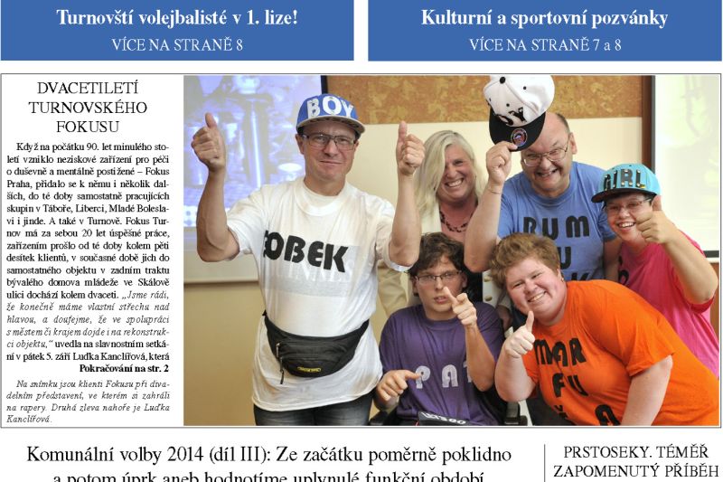 Dvacetiletí turnovského Fokusu, další díl seriálu na téma komunální volby 2014 – tentokrát na téma uplynulého funkčního období zastupitelů, zapomenutý příběh z Rovenska pod Troskami: Prstoseky, záznam zasedání turnovských zastupitelů, nabídka odpočinku v Harmonii, první díl seriálu na téma Voda, ohlédnutí za počasím letošního léta s předpovědí na zimu. To je jen stručný výčet obsahu v pořadí devatenáctého letošního vydání novin TvA. V nich samozřejmě nechybí ani výsledkový sportovní servis, pozvánky na kulturní akce a společenská kronika. Nové vydání si můžete přečíst, stáhnout, či s ním jinak pracovat na flipbooku TvA.