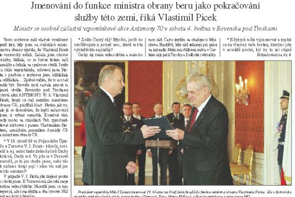 Tohle 12stránkové vydání novin obsahuje jednu velkou premiéru: původní redakční rozhovor s ministrem české vlády, narozeným v Turnově. Málokdo ví, že ministr obrany Vlastimil Picek se narodil právě v tomto městě. Osobně se s ním budete moci setkat na akci Antimony 70 v sobotu 4. května v Rovensku pod Troskami. Letošní osmé vydání novin mj. informuje o slavnostním zprovoznění cyklostezky Greenway Jizera z Líšného do Malé Skály, o aktivitě turnovského parlamentu mládeže, je tu informace-pozvánka na důležité veřejné projednání turnovské vnitroměstské dopravy, pozvánka na oficiální zahájení turistické sezony, které proběhne 27. dubna, ad. Součástí novin jsou aktuální kulturní a sportovní pozvánky a společenská kronika.