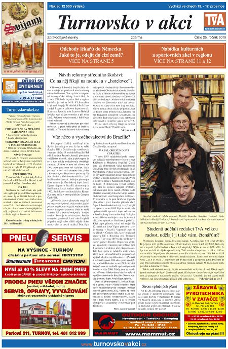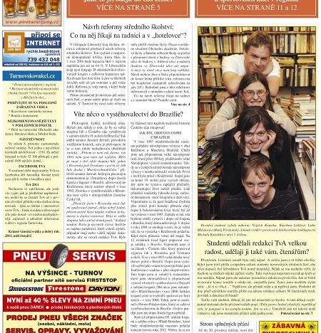 V uplynulých dnech se mezi obyvatele Turnova a spádových obcí dostalo poslední vydání novin TvA. Náklad ve výši 12.500 výtisků „obslouží“ zhruba 95 % obyvatel města a asi 75-80 % obyvatel spádových obcí. Mezi občany regionu jsme tak letos distribuovali celkem 312 tisíc výtisků novin! Aktuální vydání novin čtenářům nabídlo informaci o vývoji jednání kolem reformy středního školství, jsou zde otištěny výsledky literární studentské soutěže (a také vítězné práce), v tištěné verzi TvA najdete i rozhovor s MUDr. Janem Berndtem o tom, jaké to je, když lékař odejde do Německa, je zde také výzva k téměř neznámé kapitole dějin Českého ráje – nebo něco víte o vystěhovalectví z Rovenska do Brazílie? Součástí novin je tradiční přehled pozvánek na kulturní a sportovní akce, je tu přehled kina a výstav. To vše včetně společenské kroniky.