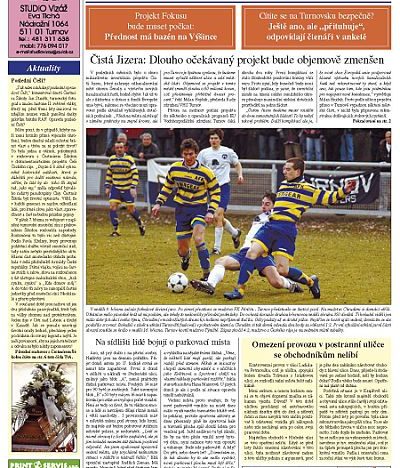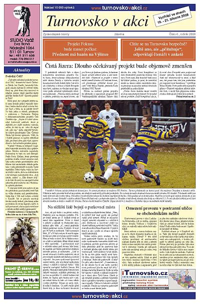 Díky zájmu o inzertní plochu, která v tištěné verzi TURNOVSKA V AKCI programově nebude zabírat víc než polovinu obsahu, protože se nejedná o inzertní noviny, bylo možné vydat také letošní šesté číslo na osmi stránkách. Obyvatelé Turnova a okolních obcí tak dostanou zdarma přímo do svých domovů více informací. Aby se postupně zvýšila informovanost občanů, to bylo jedním ze záměrů, proč projekt TvA vůbec vznikl. Z obsahu čísla jmenujme hlavně článek o problémech s parkováním v sídlišti u turnovského nádraží, dále potom zprávu, která nepotěší obyvatele tohoto sídliště a třeba také Nádražní ulice a oblasti u kasáren, protože projekt Čistá Jizera bude objemově zmenšen a na rekonstrukci těchto ulic nedojde. Noviny obsahují i společenskou kroniku, kterou si v elektronické verzi můžete přečíst ZDE.