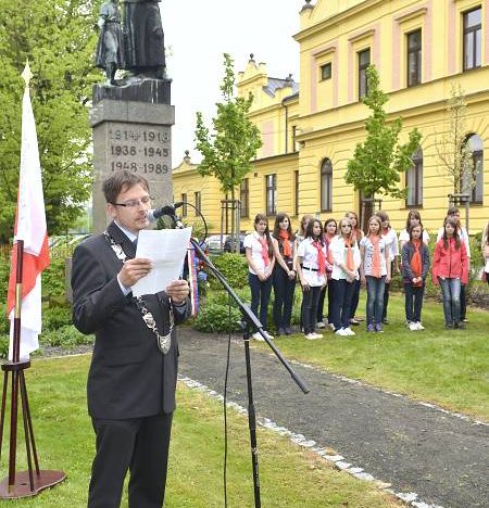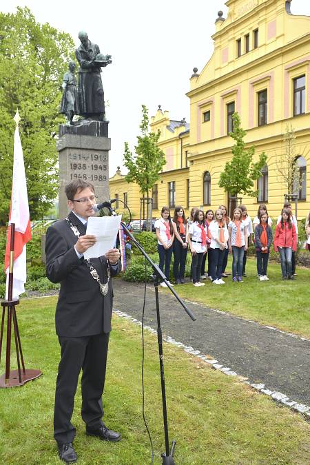 „Vždy když vidím naši vlajku stoupat po stožáru vzhůru, pociťuji zvláštní mrazení v zádech, když naši vlajku vidíme někde v zahraničí, vždy naše mysl radostí poskočí. Pohříchu ale vlajku vídáme hlavně při vítězných zápasech v hokeji a zdobené držáky na našich domech zejí prázdnotou. Vlast je místo, kde žijeme, je to náš jazyk, kultura a zvláštní typ humoru. Byl bych rád, abychom si v době státních svátků 8. května a 28. října oba tyto symboly připomínaly nejen proto, že se to má, ale že to tak cítíme. Přál bych si, abychom se nestyděli vyvěsit vlajku, dát do klopy trikoloru, přijít k pomníku položit květinu či zapálit svíčku,“ shrnul starosta s tím, že tam nahoře možná všichni sledují naše kroky: „Když naše počínání vidí, často si říkám, co si tam tak asi o nás myslí, jestli by své kroky nesměřovali jinak. Pokusme se naše chování dobrovolně změnit tak, aby se hrdinové boje za naši vlast nemuseli za nás stydět!“