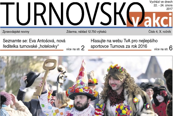 Ohlédnutí za masopustem v Radimovicích a na Dlaskově statku, informace o blížící se rekonstrukci Nádražní ulice, diskuze o občanské vybavenosti v Turnově II a o potřebách této části města. A hlavně – představení nové ředitelky „hotelovky“, která školu převezme ve středu 1. března. Tolik asi nejdůležitější témata v pořadí čtvrtého vydání novin TvA v letošním roce. Mezi další témata patří diskuze o vzniku okresu Turnov, či o vzácném úlovku mývala severního. Ti dříve narození si možná vzpomenou na Barevné středy – kulturní akce probíhající v 70. a 80. letech v Turnově u nádraží. Možná se sem tyto akce v podobném duchu zase vrátí. Standardně ke každému vydání novin patří společenská kronika a kulturní a sportovní servis.
