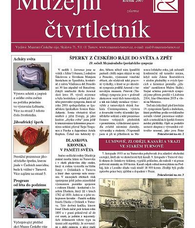 V těchto dnech vyšlo již druhé číslo Muzejního čtvrtletníku v nové grafické a obsahové podobě. Vydává ho Muzeum Českého ráje v Turnově, k dostání je zdarma přímo v budově muzea ve Skálově ulici, na Dlaskově statku v Dolánkách a v turnovských infocentrech. Na osmi stranách textu se dozvíte o nejzajímavějších událostech, ke kterým v muzeu došlo během jara, jsou tu pozvánky na akce a výstavy nadcházející a k tomu spousta dalších informací. Díváte se například v televizi na Četnické humoresky?, to by vás potom mělo zajímat, že na podzim se v muzeu chystá zajímavá výstava právě o historii četnické stanice přímo v Turnově.