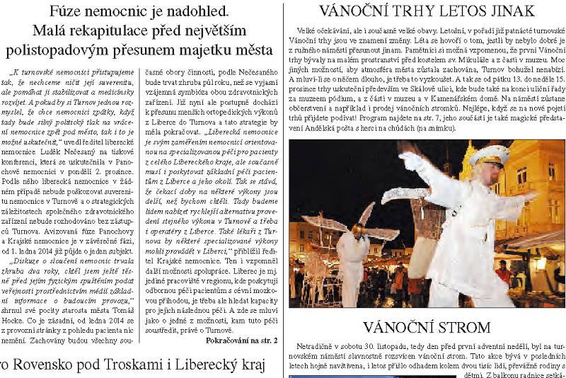 Na každém konci je pěkné, že něco nového začíná, praví klasik. V tomto týdnu jsme vyprovodili do světa poslední vydání novin TvA v letošním roce. Náklad jsme navýšili na 12.750 výtisků a s tímto také zahájíme vydávání novin v příštím roce. To už bude v pořadí sedmý ročník. Děkujeme všem za podporu, bez čtenářského zájmu a bez zájmu inzerentů by noviny vycházet nemohly… Pětadvacáté vydání novin se věnuje posledním událostem před fyzickým spuštěním fúze turnovské a liberecké nemocnice, je tu ohlédnutí za aktuálně posledním zasedáním turnovských zastupitelů, nechybí vyčerpávající servis pozvánek na předvánoční, vánoční a novoroční pořady a společenská kronika.