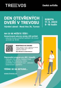 Přijďte se podívat, jak se vyrábějí kvalitní česká svítidla. V rámci dne otevřených dveří v Trevosu, který se koná v sobotu 17. června 2023 od 9.00 do 16.00 hodin, bude možné nahlédnout do výrobních prostor podniku. Budete si moci prohlédnout výrobní halu a uvidíte, jak vyrábíme naše produkty od začátku až do konce. K dispozici vám budou také naši zaměstnanci, kteří zodpovědí všechny vaše dotazy týkající se výroby. Tato příležitost není každý den, rozhodně tedy neváhejte a přijďte k nám na komentovanou exkurzi!